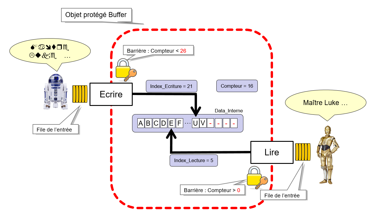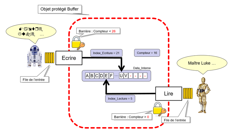Buffer.Ecrire (Data => Character'Val (I + 64)); --> si la barrière est fermée alors