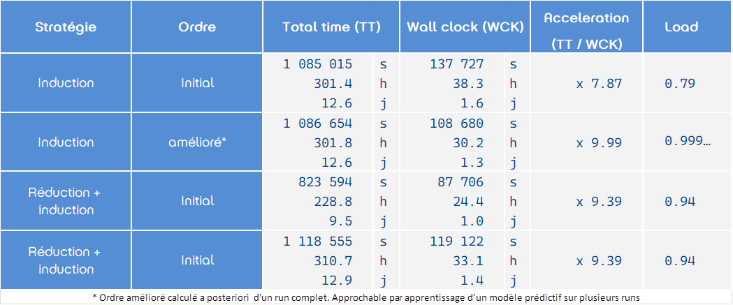 - La stratégie de réduction appliquée à l’ordre initial réduit de plus de 20% le Total time et monte le Cluster load à 94%