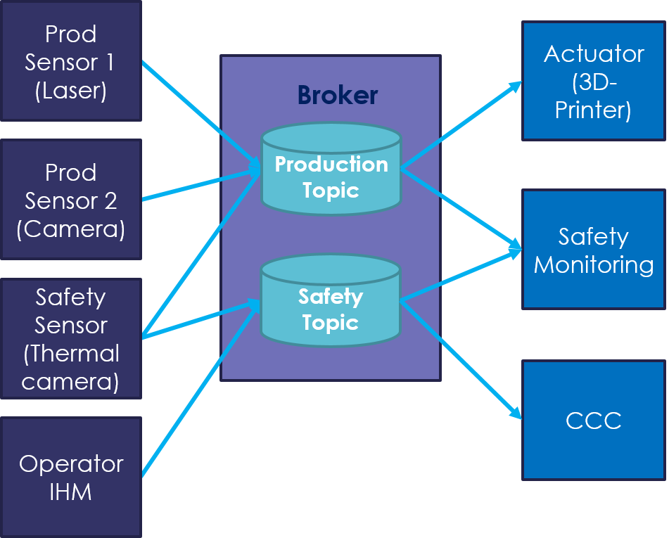 In a network topology where numerous (typically several hundreds) captors and actuators need to communicate with supervisors, a classical client-server approach requires a dense connection mesh to gather and distribute information. In this perspective, the PubSub mechanism is interesting because the supervisors only need to send one message to communicate information to all the remote devices.