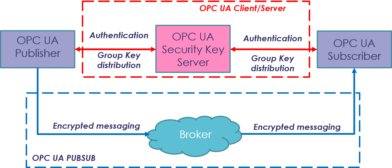 OPC UA PubSub two main phases are described in Figure 3, where communications using OPC UA Client/Server paradigm (i.e. authentication and key distribution) are colored in red, while communications using the PubSub paradigm (i.e. encrypted messaging) are colored in blue.