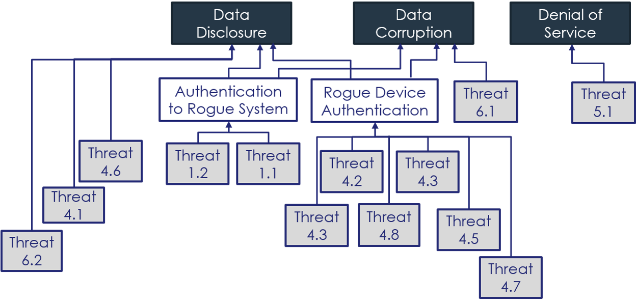 In the following assessment, we describe threats following the STRIDE approach, and then mention the related ISA/IEC 62443 security requirement as expressed in part 4-2 (component security) of the standard. Figure 8 illustrates the dependencies between the different threats, leading to 3 feared events (in black in the figure): data disclosure, data corruption and denial of service.