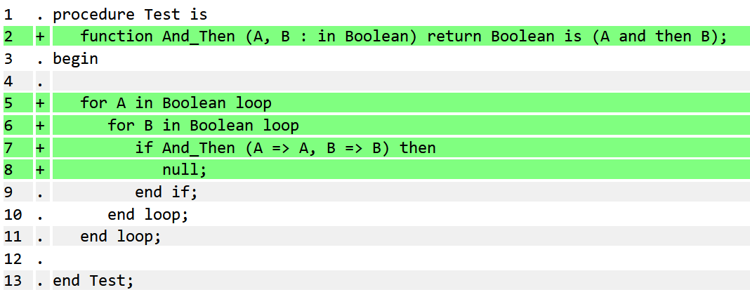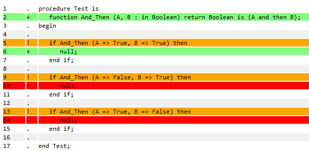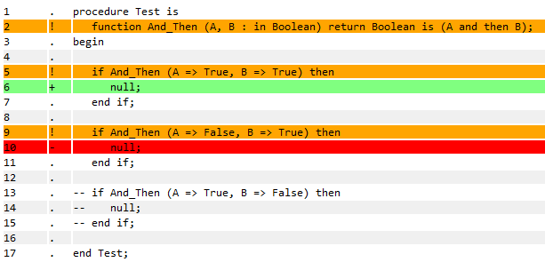Si nous générons la couverture de ce code en Statement+MC/DC avec l’outil GNATCoverage, on obtient :