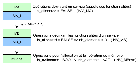 Note : Dans l’architecture d’un modèle B, un module développé possède des machines abstraites (.mch), des éventuels raffinements (.ref) et des implantations (.imp). Les implantations sont traduites automatiquement en code d’un langage de programmation. Un module de base ne possède pas d’implantation : le code associé à un module de base ne s’obtient pas par une traduction (B -> C / Ada), mais par un codage manuel (cf. Manuel de Référence du Langage B).